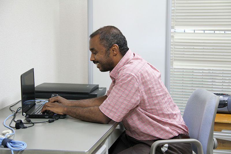 Usando un ordenador en una de las aulas de estudio de la universidad. Su tema de investigación es la solución del conflicto bélico en Sudán.