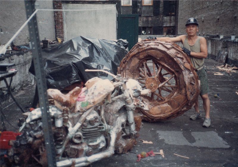 Una pieza de la serie “Esculturas de motocicleta”, hecha con cartón. El artista en Dallas, Texas, en 1983 (cortesía de Zazie Films)