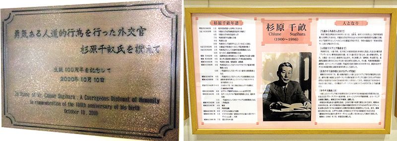 El año 2000 marcó el centenario del nacimiento de Sugihara, y el 10 de octubre, aniversario del restablecimiento de las relaciones diplomáticas entre Lituania y Japón, se celebró una ceremonia para mostrar la placa de Sugihara, que se convirtió en el símbolo del restablecimiento de su honor por parte del Ministerio de Asuntos Exteriores, tras más de cincuenta años desde que dejara su puesto, en junio de 1947. Derecha: exposición en la entrada del Museo de Historia Diplomática.