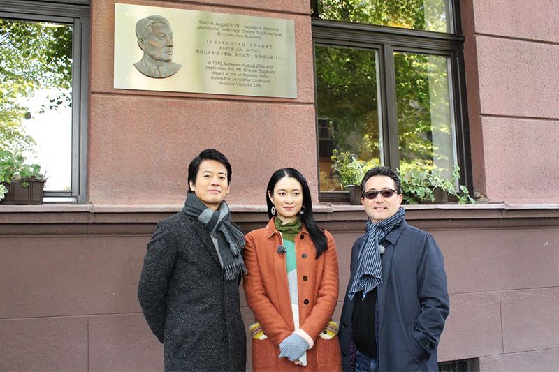 Karasawa Toshiaki, Koyuki y Gluck frente al hotel Metropolis de Kaunas, en el que se alojó Sugihara Chiune antes de abandonar Lituania. En este hotel Chiune continuó expidiendo visados tras el cierre del consulado, a finales de agosto de 1940. ©2015 Comité de Producción de Sugihara Chiune
