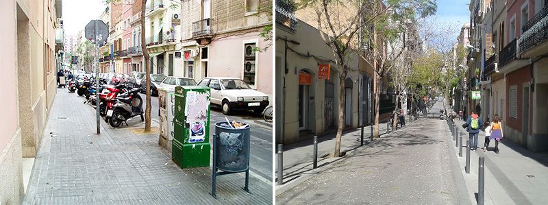 Calles de Gracia antes del proyecto de peatonalización (izquierda) y después (derecha).