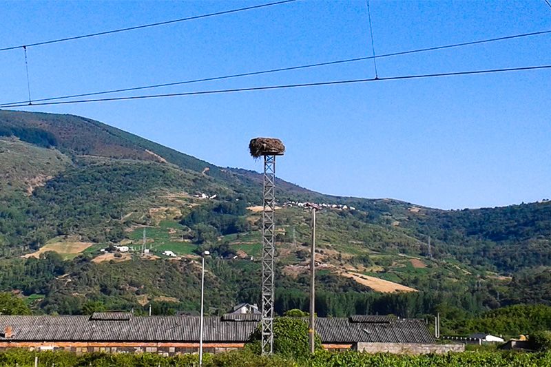 Paisaje de Petín, el pueblo donde Yoshimura pasa las vacaciones de verano. Encima de la torre metálica hay un nido de cigüeñas. Estos nidos son muy comunes en España.