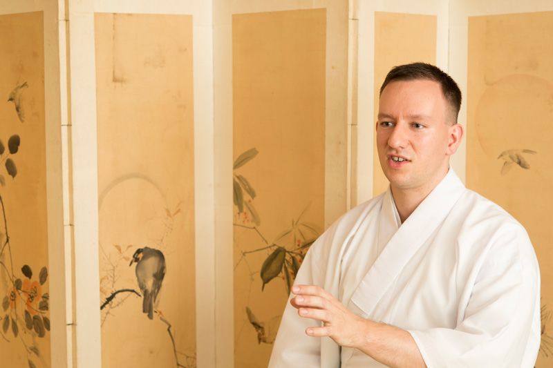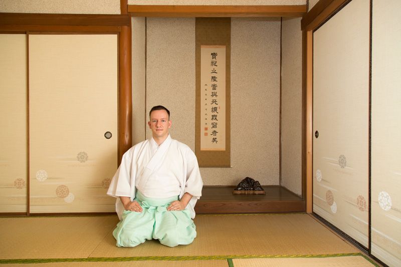 Fotografía de la cabecera: Florian Wiltschko, posa, con la vestimenta formal propia de los sacerdotes sintoístas, en la sala para rezar del santuario Nobeno.