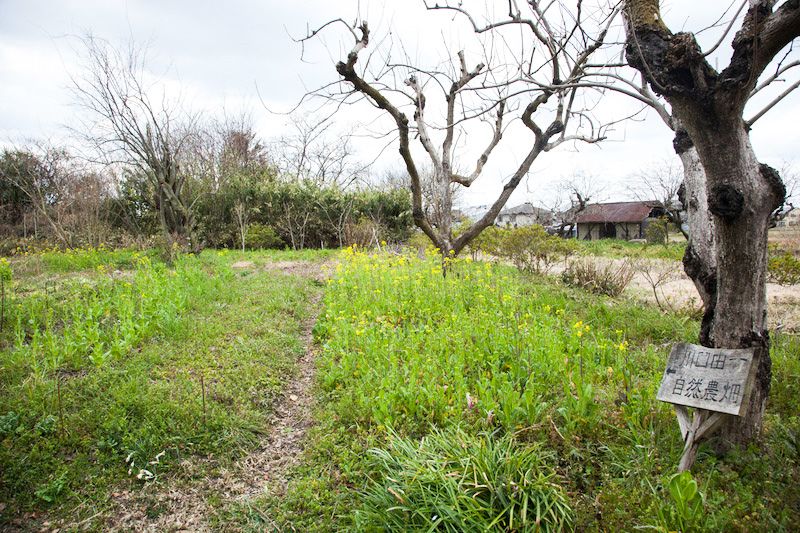 El letrero dice: “Kawaguchi Yoshikazu - Cultivos naturales”. En primavera los campos están cubiertos por las flores amarillas de plantas oleaginosas.