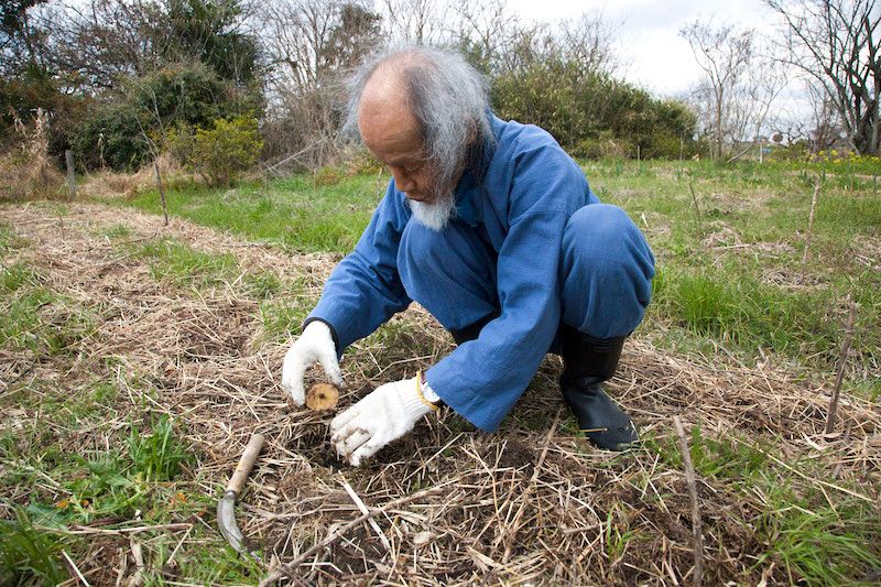 KAWAGUCHI YOSHIKAZUEn la agricultura, la clave está en no arar el suelo. Si dejamos que la naturaleza haga su trabajo, gracias a los seres que viven en ella, las plantas, insectos, microorganismos, etc, el suelo se reblandece y no resulta necesario arar. Si aramos, estamos produciendo un círculo vicioso, ya que destruyendo el medio vital de innumerables insectos y microorganismos, solo podremos obtener cosechas echando abono.