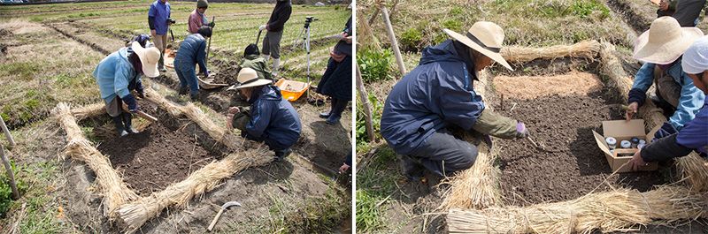 Marzo. Kawaguchi siembra patatas, apartando la alfombra de hierbas secas para hacer los hoyos.