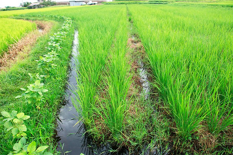 Arrozal inundado, cultivado por métodos naturales. Normalmente, los plantones de arroz se colocan en manojos, pero Kawaguchi prefiere aislarlos de uno en uno. Por eso las plantas ya grandes dan la impresión de desarrollarse de una forma más desahogada. En los caballones que forman el borde del arrozal (aze), Kawaguchi sigue la costumbre japonesa de plantar soja, que por esta razón recibe también el nombre de azemame (legumbre de aze; en la fotografía, a la izquierda).
