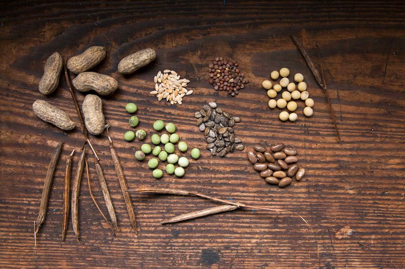 Semillas de cacahuete, mulujíe (Corchorus olitorius), sandía, daikon (Raphanus sativus var. Longipinnatus) y soja, todas de producción propia. Algunas de ellas, Kawaguchi las viene produciendo desde hace más de 40 años.