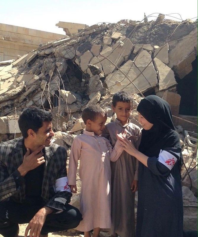 En 2015, con gente de la zona norte de Yemen, donde Médicos Sin Fronteras presta ayuda a un hospital local, una sección del cual quedó destruida en un bombardeo aéreo. © MSF.