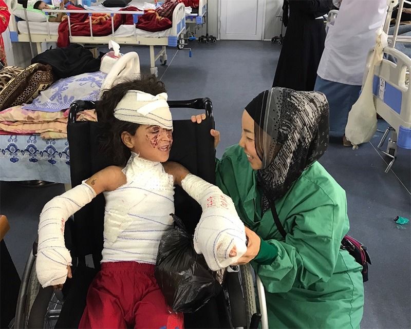 En 2017, con una joven herida que recibía tratamiento en Mosul Este, Irak. ©MSF.