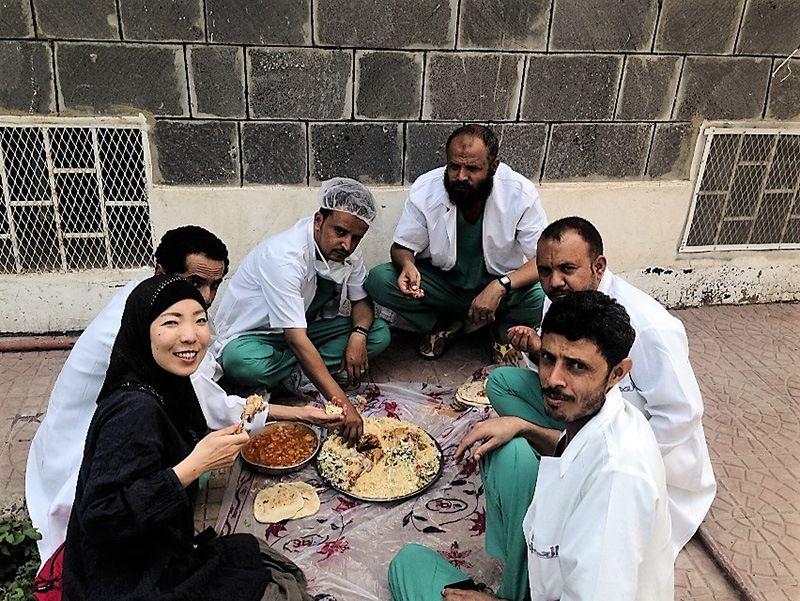 En 2017, disfrutando de una comida en compañía del personal local, durante una misión en Yemen. ©MSF