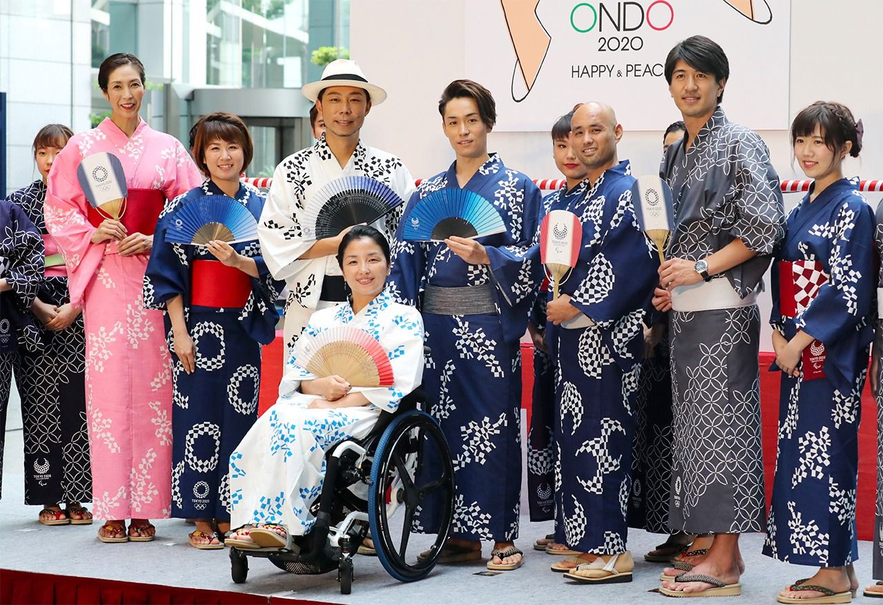 Acto de promoción de los Juegos Olímpicos y Paralímpicos de Tokio celebrado en 2018. Taguchi está en primera fila, en el centro. En segunda fila, de izquierda a derecha: Ōbayashi Motoko, la jugadora de bádminton Fujii Mizuki, los componentes del grupo EXILE USA y TETSUYA, Yamamoto Atsushi, que participó en atletismo y snowboard en los juegos paralímpicos de verano e invierno, y otros dos deportistas. Imagen tomada en Shinjuku, Tokio. (Jiji Press)