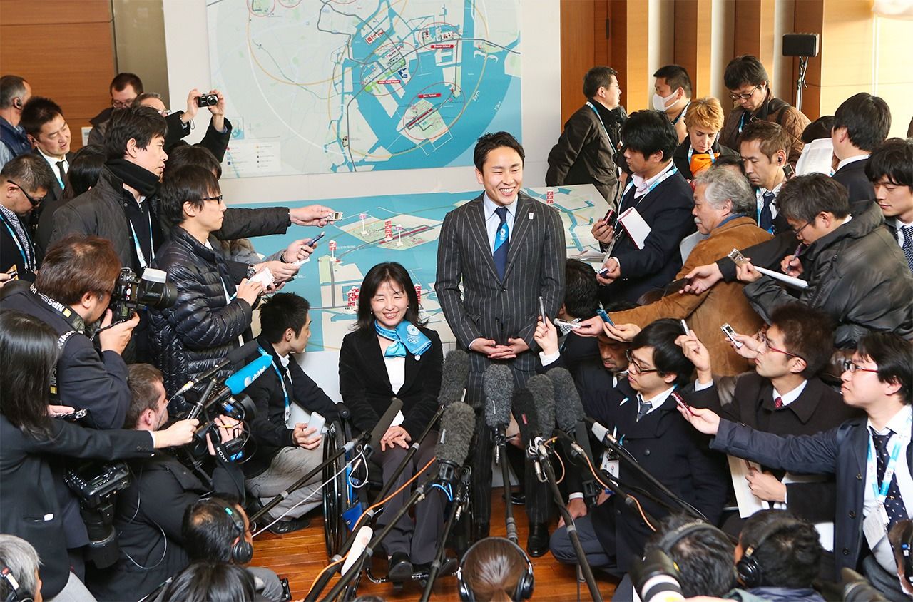 Ōta Yūki (centro derecha) y Taguchi Aki (centro izquierda) responden a las preguntas de los periodistas tras la presentación ante la Comisión de Evaluación del Comité Olímpico Internacional (COI) en 2013. (Jiji Press)