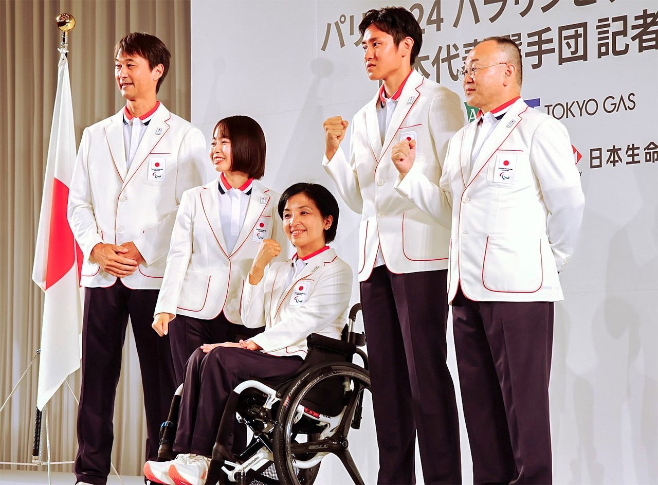 Deportistas japoneses posando en la ceremonia de la delegación paralímpica de París. De izquierda a derecha: el vicepresidente de la delegación Nakazawa Yoshihiro, la nadadora Nishida An, la presidenta de la delegación Taguchi Aki, el atleta Ishiyama Daiki y el vicepresidente de la delegación Ida Tomohiro. (Fotografía: Matsumoto Sōichi)