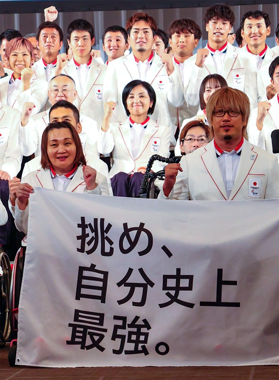 El equipo japonés sostiene un cartel con el lema en la ceremonia de la delegación de los Juegos Paralímpicos de París como muestra de su compromiso a esforzarse al máximo. Taguchi figura en el centro. Imagen tomada el 16 de julio de 2024 en un hotel del distrito tokiota de Chiyoda. (Fotografía: Matsumoto Sōichi)