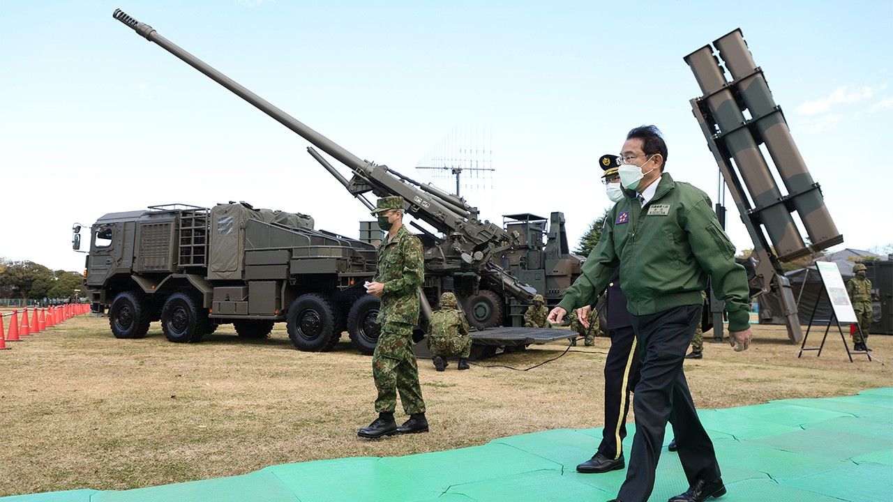 Fotografía: El primer ministro Kishida Fumio (primer plano) durante una visita de inspección a la base de la Fuerza Terrestre de Autodefensa en Asaka (prefectura de Saitama) el 27 de noviembre de 2021. (Jiji Press)