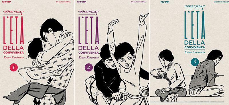 Las portadas de los tres volúmentes de Dōsei Jidai en Italia, traducidos por Paolo La Marca y publicados por J-Pop.