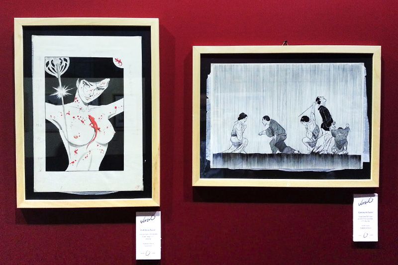 Dos paneles con viñetas de Beni tokage (El lagarto escarlata, a la izquierda) y Shurayukihime (Lady Snowblood, a la derecha) durante la exposición sobre Kamimura Kazuo en Lucca.