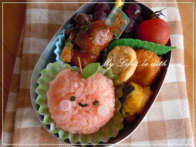 El otoño es temporada de manzanas en la prefectura de Nagano, así que este bentō lleva una "manzanita" de arroz, y setas y uvas, que son productos propios de esta estación también.
