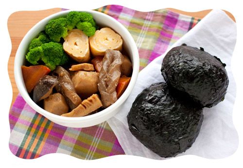 Preparé esto cuando acababa de volver del extranjero; me apetecía comer algo preparado con un buen caldo de pescado y algas, algo que tuviera un sabor japonés auténtico. El aroma del caldo hecho con bonito seco y de las setas shiitake secas es aliviador. Las bolas de arroz omusubi están muy buenas si se envuelven en un paño en vez de en papel film, ya que la tela absorbe el agua sobrante del arroz y éste no se pega.