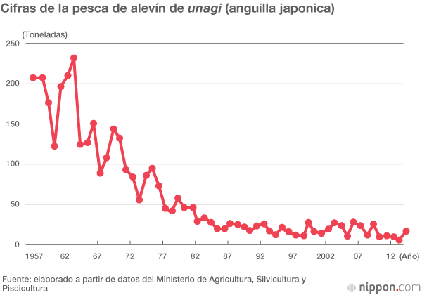 Dicen que Japón es responsable del 70% del consumo mundial de anguila. Los países que crían anguila en todo el mundo son principalmente Japón, China, Corea del Sur y Taiwán. Estos cuatro países firmaron en mayo de 2014 un acuerdo para limitar la cantidad de alevín de anguila a pescar, acuerdo que entró en vigor a partir de noviembre de este año. En Japón los piscicultores están ahora obligados por ley a informar a las autoridades de las cantidades de anguila que crian y de la facturación.