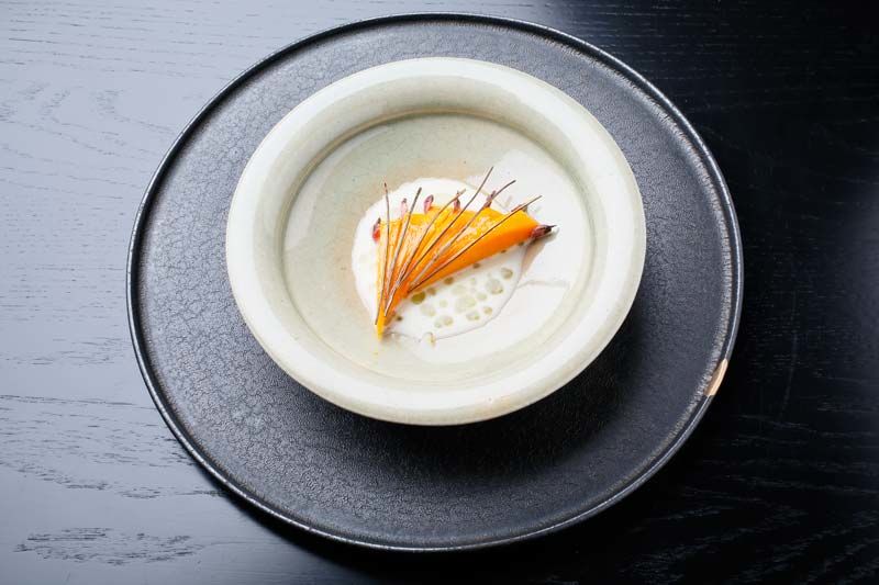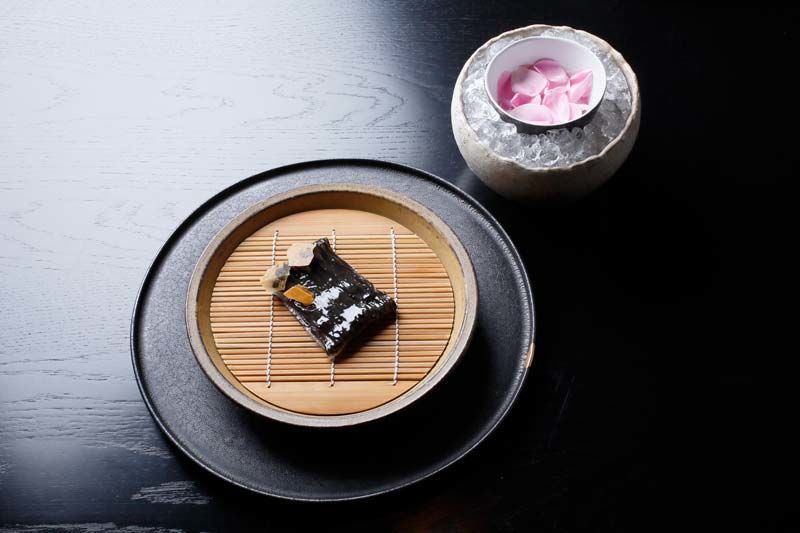 “Sepia con rosas frescas”: sobre la sepia cortada en fideos se monta sepia fermentada y tofu ahumado al miso, se barniza con pasta de seta maitake, se rocía con caldo de pino y se espolvorea con copos de alga oni konbu secada lentamente a 60 grados. En lugar de la salsa tsuyu se utiliza aceite de sésamo blanco con aroma de rosas de Ishigaki.