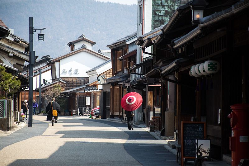 Gifu es una antigua ciudad formada en torno a un castillo y en sus calles de arquitectura tradicional las sombrillas janome (“ojo de serpiente”) encajan a la perfección. La circunferencia blanca de la pantalla es el origen del curioso nombre.