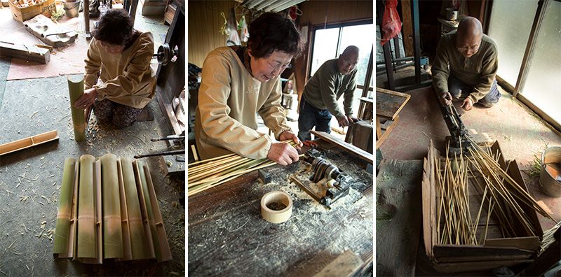 Fabricación de armazones de bambú para sombrillas. Los nudos del madake (variedad de bambú) se liman (izquierda). La caña se raja a filo de cuchilla en varillas de tres milímetros de grosor y los nudos se horadan para pasar el hilo (centro). Las varillas se pulen para adelgazarlas (derecha).
