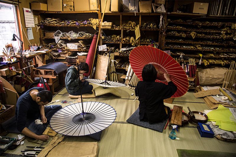 Jóvenes aprendices deseosos de aprender las técnicas tradicionales trabajan codo con codo en el taller de sombrillas de Sakaida Eikichi.