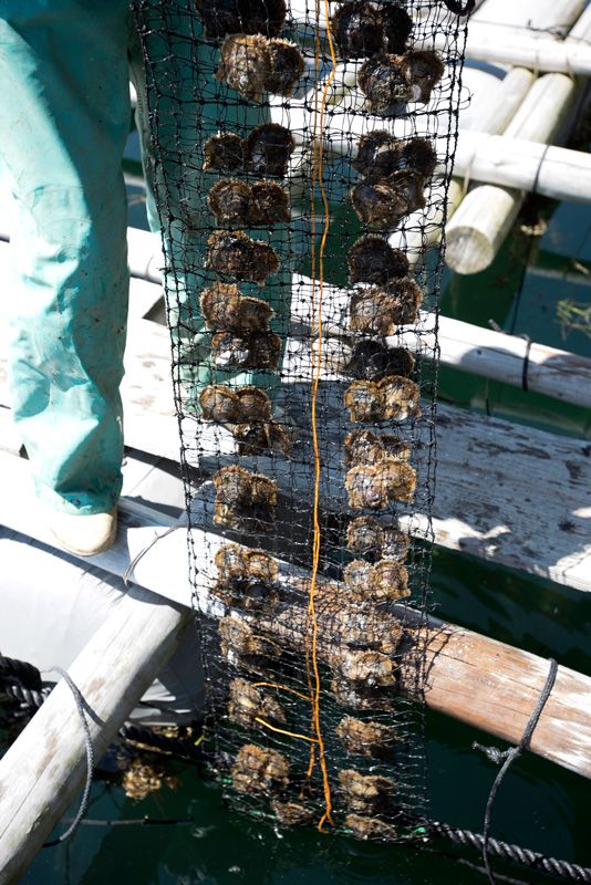 Las otras Akoya se cultivan en parejas, en redes suspendidas bajo las barcazas de perlas.