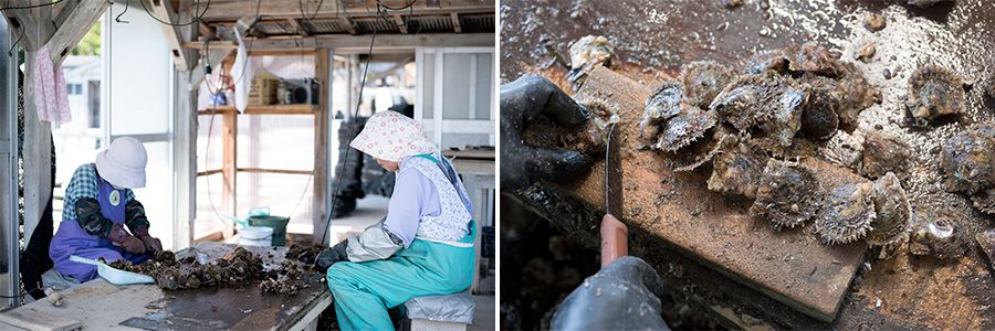 Tras quitar la cuña de madera que ha mantenido la concha del molusco ligeramente abierta durante la operación, la técnica añade la criatura a una caja que contiene docenas de ostras Akoya, impregnadas de igual modo, las cuales esperan a que las devuelvan a las aguas de la bahía de Ago.