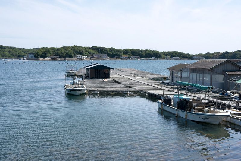 Las barcazas de Inoue Hikaru flotan sobre las plácidas aguas de la bahía de Ago.