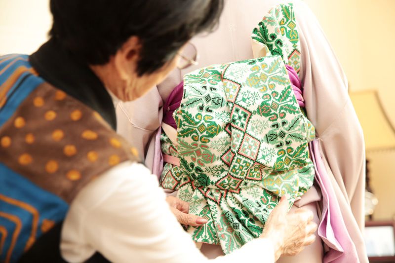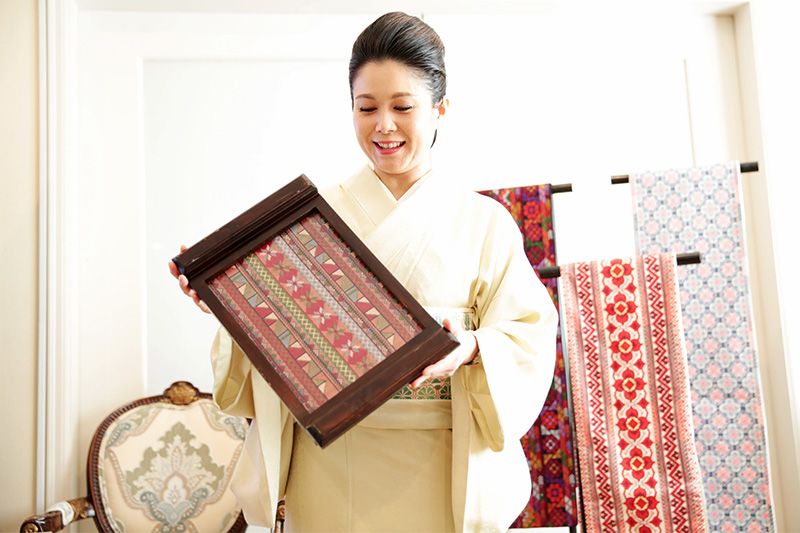 "Me entraron ganas de ir allí tras escuchar las historias de Yamamoto", Ueki Yoshimi, maestra de primera categoría en el arte de coser kimonos. Ueki desconocía la realidad del conflicto en Palestina y se sorprendió de las maravillas de la artesanía local. Aquí la vemos con un obi de doble tejido (imagen cortesía del Centro de Arreglos Matsukawa).