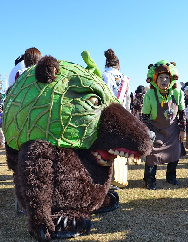 Otro personaje que no era precisamente adorable era Melon Kuma, un oso de aspecto feroz con una cabeza con forma y textura de melón. La mascota viene de Yūbari, Hokkaidō, una ciudad famosa por sus melones, y temerosa de los osos que se los comen. La fiereza del personaje contrastaba con su encantador secuaz, una anciana que también contaba con cabeza en forma de melón.