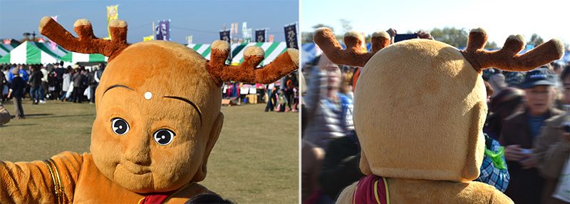 Y todo el mundo conoce al niño Buda con un par de astas que le salen de la cabeza, Sento-kun, una mascota presentada en 2008 por la antigua capital de Japón, Nara, como conmemoración del 1300 aniversario de la ciudad. Inicialmente ridiculizado por ser kawaikunai (feo), el peor insulto imaginable en un Japón obsesionado con lo adorable, el personaje ha logrado un lugar en los corazones de muchas personas pese a (o precisamente por) su ternura cuestionable. Para ser sincero, venía espantado por las imágenes que había visto de Sento-kun, y estaba dispuesto a reírme de él. Pero cuando por fin me encontré con la mascota en el evento, me conquistó al instante con sus grandes ojos redondos y su expresión de “ah, qué plasta; tengo astas en la cabeza”.