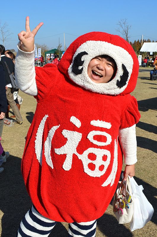 Tras ese roce con la fama, fue refrescante toparme con Yamadaruma, que representa a... bueno, a Yamada Ruma, la mujer tras el disfraz. Por lo que pude ver, fue la única fan de las mascotas que vino al evento vestida como una mascota, con un traje rojo en forma de muñeca Daruma (figuras votivas que simbolizan a Bodhidharma, el fundador de la secta Zen del budismo).