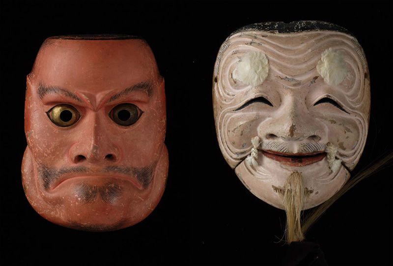 A la izquierda, máscara kobeshimi del período Kamakura (1185-1333) elaborada por el maestro artesano Shakuzuru. A la derecha, máscara okina del período Heian (794-1185) elaborada por el maestro Miroku.