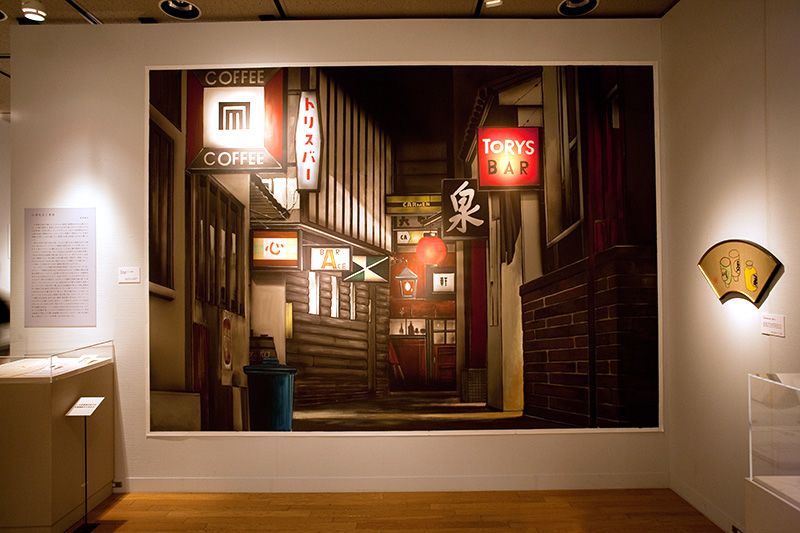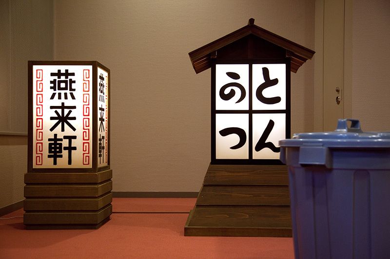 En la presente exposición también se han instalado mecanismos para que los visitantes puedan divertirse sacándose una foto de recuerdo. Uno consiste en un fondo a gran escala que reproduce los bares que se alinean en la callejuela de Sanma no aji (abajo a la izquierda). Los diseños de los carteles, por supuesto, son de Ozu. Y el segundo se encuentra en la recepción, donde se han recreado las linternas y carteles de los locales, también diseñadas por Ozu para la misma película. Si uno se agacha puede experimentar de primera mano esa característica baja posición de la cámara de Ozu (abajo a la derecha). Al ver los carteles a tamaño real se nota claramente que son demasiado grandes pero no serían incompatibles en pantalla. Se podría decir que es una de las técnicas de Ozu, que dedicó mucha energía a pensar sobre el punto de vista y el espacio. La Asociación Japonesa de Directores de Arte para Cine y Televisión ha colaborado en la creación tanto del fondo como de los carteles, para esta exposición.