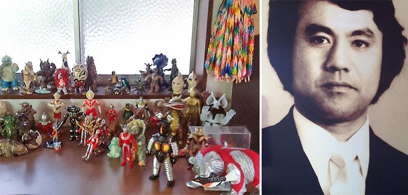 La casa donde nació Kinjō Tetsuo (derecha) en Haebaruchō, Okinawa, es ahora el restaurante Shōfūen. En la estancia que fuera el estudio del guionista se conserva el Museo de Kinjō Tetsuo, que puede visitarse bajo petición. El escritorio está repleto de muñecos de Ultraman que dejaron los fans que lo visitaron. (Fotografía: Museo de Kinjō Tetsuo)