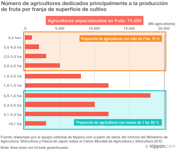 Por el contrario, el territorio nacional de Japón es estrecho y alargado, y cerca del 80 % del terreno lo ocupan montañas. En el año fiscal 2010, la superficie media empleada por una entidad de explotación agrícola fue de 2,2 hectáreas; y el 85 % del cultivo de árboles frutales, una tarea laboriosa, se realizaba en terrenos de menos de 2 hectáreas. En el cultivo de frutas es necesario, en muchas ocasiones, emplear técnicas avanzadas para realizar labores difíciles con la ayuda de máquinas y para la poda, de ahí que se trate de una actividad intensa. Entre los productores japoneses dedicados al sector frutícola abundan las explotaciones familiares de pequeño tamaño; por consiguiente, si se quiere aumentar la rentabilidad, a la fuerza se invierte tiempo en cultivar productos de buen aspecto y sabor y alto precio. Por ejemplo, en el caso de los melones cantalupos, su aroma se potencia gracias a que se trabaja para dejar solo una pieza por árbol y poder concentrarse así en el cuidado de esta. La humedad característica de la lluvia por la que se caracteriza el clima de Japón se traduce también en un agua de buena calidad, de ahí que la fruta haya pasado a considerarse más bien como un pequeño placer.