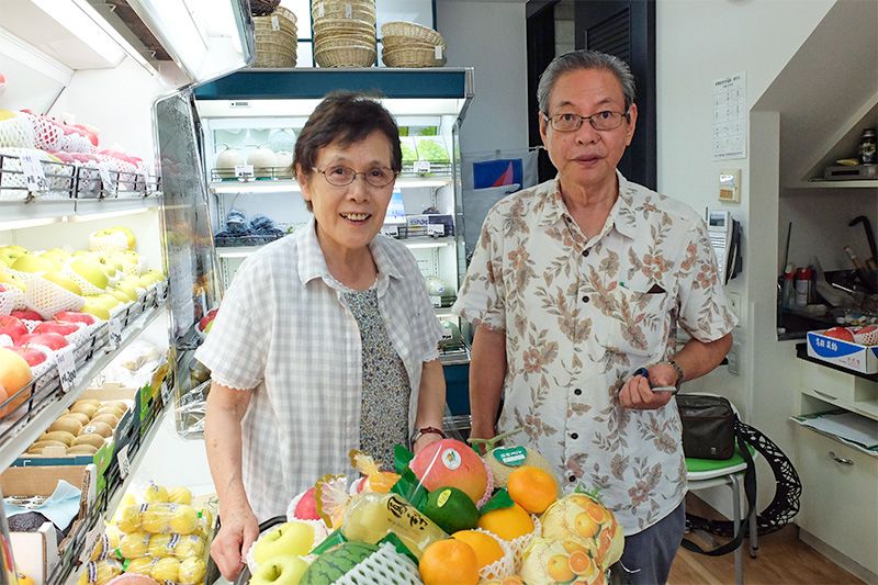 Hashimoto Yoshihei y su esposa en su establecimiento, que lleva 101 años ofreciendo fruta para regalar (imagen de Nippon.com).