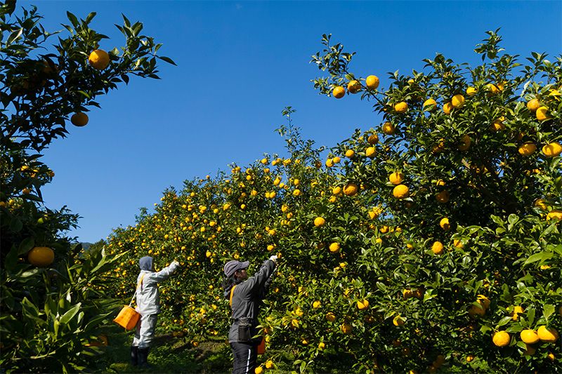 Dos personas recolectan yuzus en la plantación de Tosa Kitagawa. (©Kusano Seiichirō)