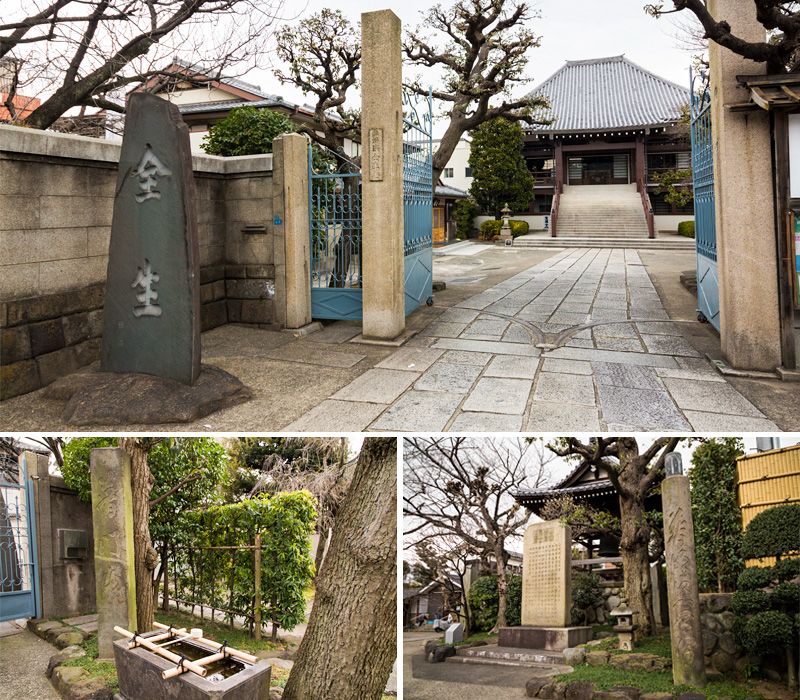 (Arriba) El Zenshō-an visto desde la entrada. (A la izquierda, abajo) En uno de los pilares que se conservan del momento de la fundación del templo se puede ver cincelado con la letra de Yamaoka Tesshū el sobrenombre del Zenshō-an, “Fumonzan”. (A la derecha, abajo) Una lápida en memoria de Yamaoka Tesshū. El título del epitafio es de la letra del noble y político Arisugawa-no-miya Taruhito Shin'nō y el poema es de la de Katsu Kaishū.