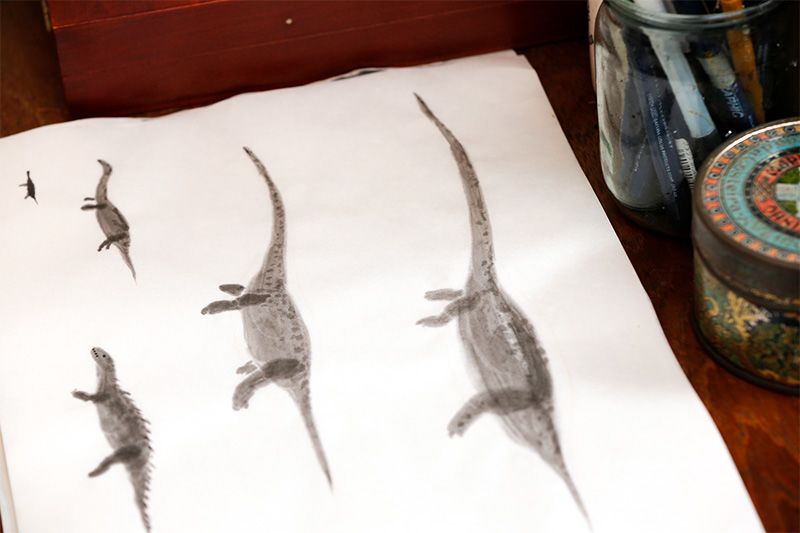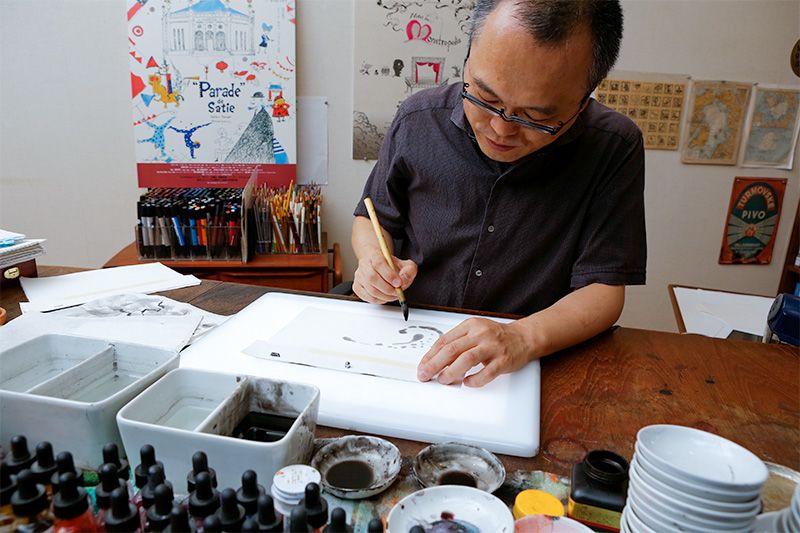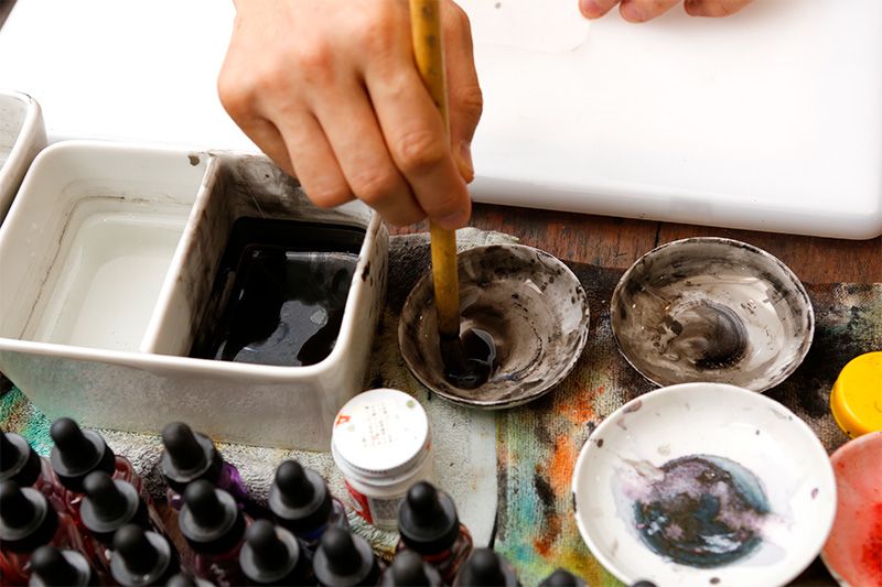 Yamamura pinta directamente sobre el papel, con diferentes tipos de acuarelas y tinta