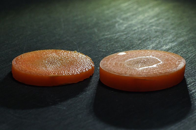 Antes de nada, veamos cómo cortan los wabōchō. A la izquierda tenemos una rodaja de zanahoria cortada con un cuchillo de acero inoxidable industrial; a la derecha, una sección perfecta de zanahoria obtenida con el corte suave de un wabōchō.