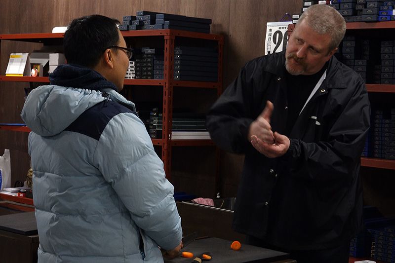 Björn explica las ventajas de los wabōchō a un cliente.