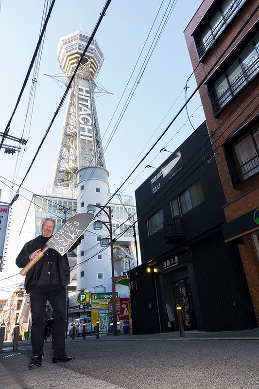 Björn sonríe delante del Taller de Cuchillería Tower Knives Osaka, con la torre Tsūtenkaku de fondo.