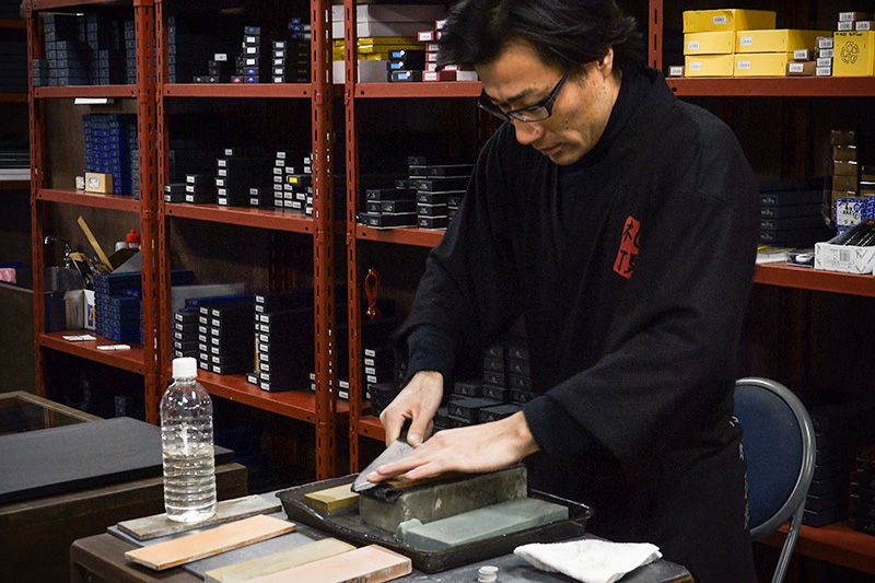 El artesano Kobayashi Hiroki de Seki (Gifu) realiza una demostración de afilado en el establecimiento.