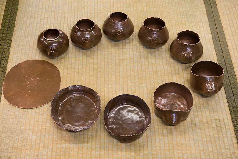 El proceso de elaboración empieza en la plancha plana de cobre de la izquierda y evoluciona en el sentido contrario al de las agujas del reloj. Suelen trabajarse varias piezas a la vez en cada etapa del proceso pero, en el caso de elaborar una sola de principio a fin, se tardaría más de dos semanas en completarla. A eso se refiere Yamada cuando sentencia que “la artesanía del cobre conlleva un gasto enorme de mano de obra”.
