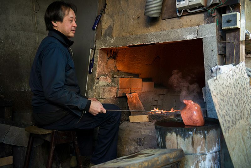 El jefe de artesanía Tamagawa ejecuta el proceso de yakinamashi.